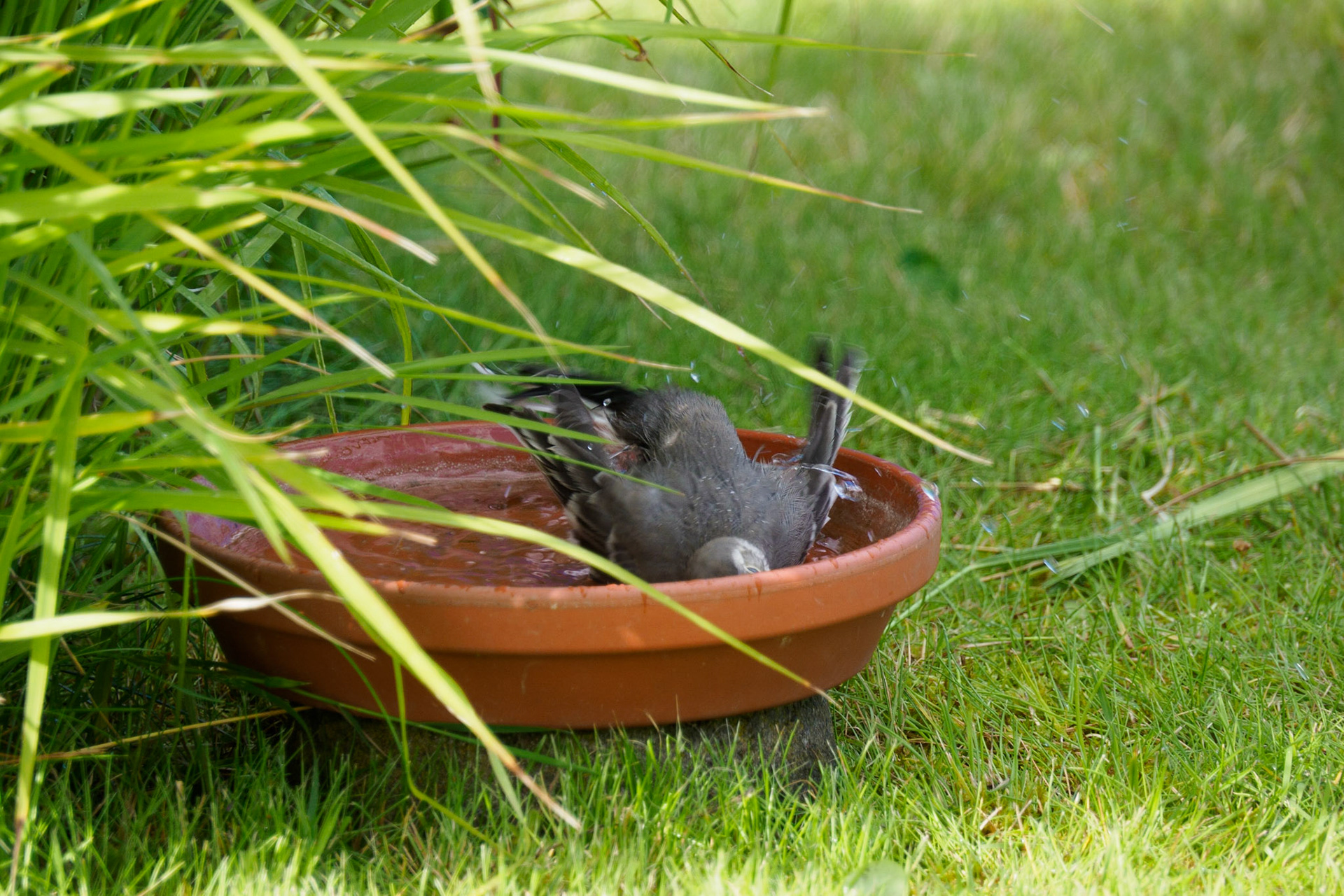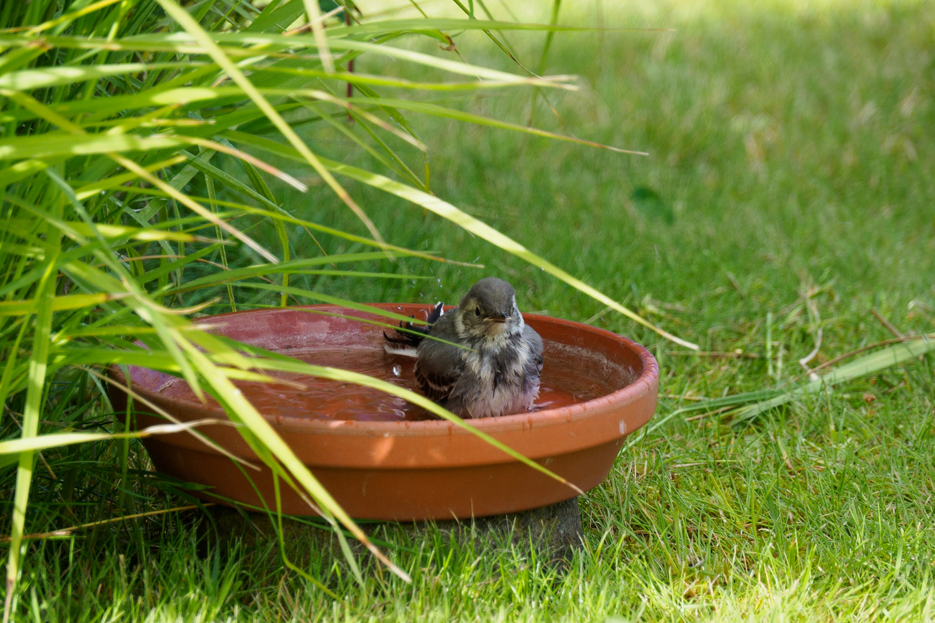 Junge Bachstelze beim Baden